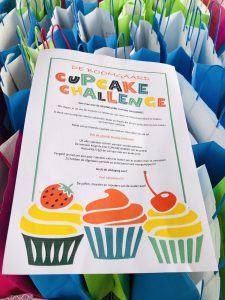 Ondanks de regen stonden de juffen en de moeders van de ouderraad klaar met kleurrijke tasjes. In ieder tasje zaten bakspullen voor cupcakes samen met een brief. Door middel van deze brief werden de kinderen door de school uitgedaagd om mee te doen met De Boomgaard Cupcake Challenge. De opdracht was heel simpel. Bak verschillende cupcakes en versier deze zo mooi mogelijk. Maak van de mooiste cupcake een foto en stuur deze naar de juf. Uit alle inzendingen wordt in iedere groep de mooiste cupcake gekozen. De winnaar mag zich Cupcake bakker van de klas noemen.