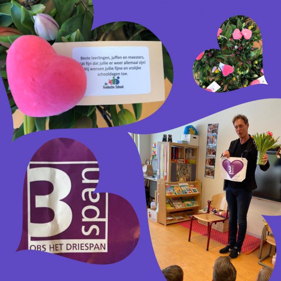 Puttershoek – Meester Albert bezocht alle groepen vandaag met een Driespanhart en een bosjes bloemen van Stichting de Hoeksche School voor alle groepen. Iedereen is weer van HARTE welkom op Het Driespan in Puttershoek.