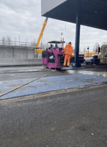Tijdens het weekendwerk worden er kabelgoten gelegd op het tolplein. Alle kabels voor stroom, data etc. gaan door deze kabelgoten.Hiervoor is het noodzakelijk dat de betonnen aanrijdbeveiliging eruit gezaagd wordt.