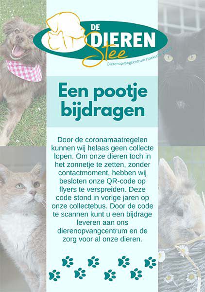 De flyer zal van af 21 juni in Numansdorp huis aan huis worden verspreid met in achtneming van de meldingen op de brievenbus. Op de flyer staat een QR code. Deze code kunt u scannen met een mobiel en verwijst u door naar de donatie pagina van de Dierenstee. (https://www.dierenstee.nl/donatie/)