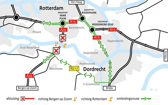 - Verkeer van/naar de Hoeksche Waard wordt omgeleid over de N217