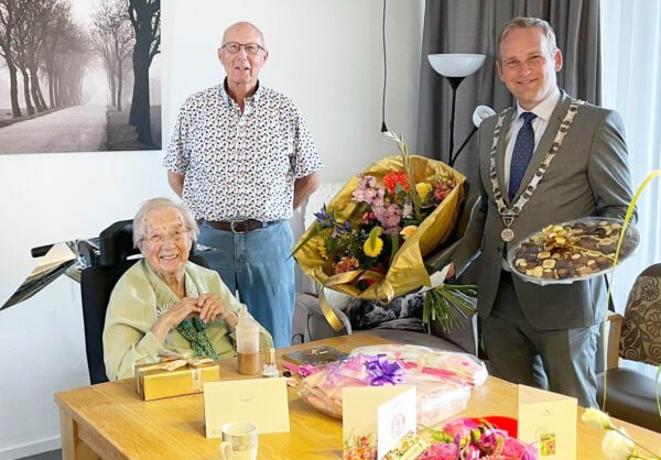 Strijen – Vandaag, vrijdag 27 augustus, is het feest in de Hoge Weide in Strijen. Mevrouw Trouwborst-Barendrecht viert namelijk haar 104e verjaardag. Natuurlijk ging burgemeester Bram van Hemmen langs om haar namens het gemeentebestuur te feliciteren. Hij kwam niet met legen handen en overhandigde mevrouw Trouwborst een feestelijke bos bloemen en een schaal met haar leeftijd in bonbons.