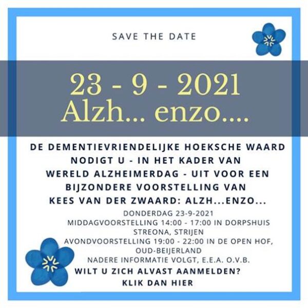 In de week van Wereld Alzheimerdag wordt ook in de Hoeksche Waard aandacht besteed aan het thema dementie. Natuurlijk niet alleen in deze week, maar in deze week wel iets meer. In deze week haalt de projectgroep Dementievriendelijke Hoeksche Waard de gevoelige, realistische en humoristische theatervoorstelling Alzh… enzo… van Kees van der Zwaard naar Strijen en Oud-Beijerland.