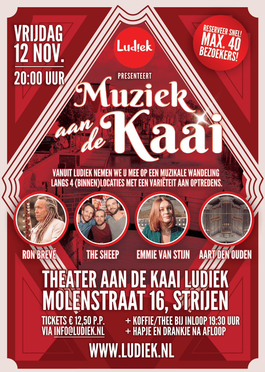 Strijen – Na lange tijd weer een mooie culturele activiteit in Ludiek, cultuurhuis in Strijen. Op vrijdagavond 12 november worden bezoekers meegenomen op een muzikale wandeling met een variëteit aan optredens langs 4 (binnen)locaties langs de Kaai in Strijen.