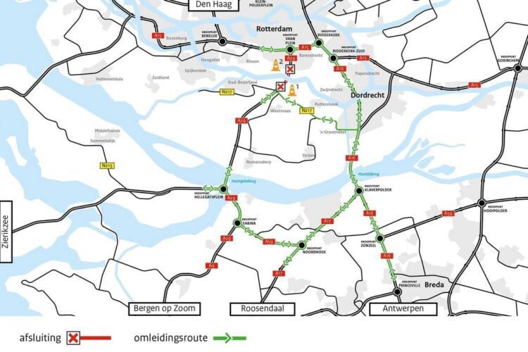 - Verkeer vanuit Goeree-Overflakkee, West-Brabant en Zeeland wordt omgeleid via de A17 en de A16.