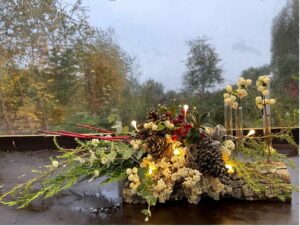 Alle ingrediënten voor een klassiek kerststuk met een knipoog zijn aanwezig; sneeuwbes, hulst, eucalyptus, IJslands mos, dennenappels en kerstgroen.