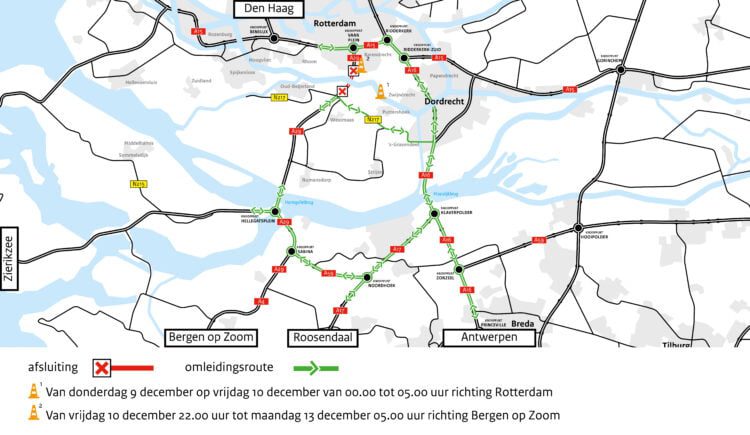 - vrijdag 10 december 22.00 uur tot maandag 13 december 05.00 uur de tunnelbuis richting Bergen op Zoom (richting het Zuiden), inclusief oprit Barendrecht (20)