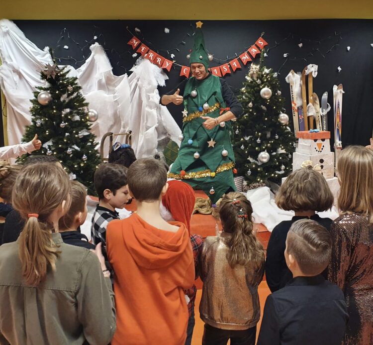 Niet alleen de leerlingen en juffen en meesters hadden namelijk hun mooiste kleding aan, ook meester Albert had zichzelf helemaal mooi opgetuigd. Als muzikale kerstboom zong en rapte hij er dan ook op los met de leerlingen. “Oh dennenboom, oh dennenboom wat zijn je takken, je takken, je takken wonderschoon!”