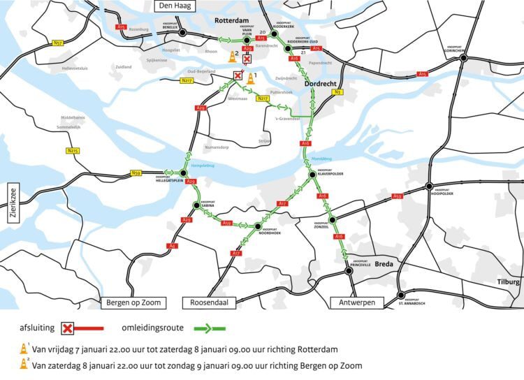 - vrijdag 7 januari 22.00 uur tot zaterdag 8 januari 09.00 tunnelbuis richting Rotterdam, inclusief oprit Oud-Beijerland (21)