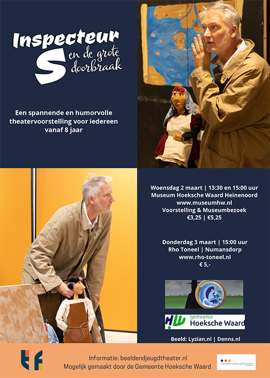 Op dinsdag 1 en maandag 7 maart speelt Inspecteur S en de grote doorbraak besloten voorstellingen in het Wijckplein – Huiskamer van de Wijk in Oud-Beijerland en in de Hoeksche Huiskamer in De 3 Lelies in Puttershoek.