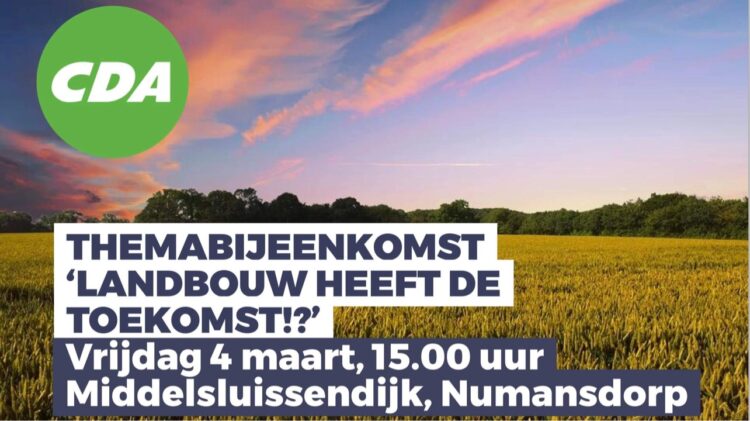 Inwoners, ondernemers, maatschappelijke organisaties en andere belangstellenden zijn van harte uitgenodigd voor deze informatieve en interessante bijeenkomst, net als bestuurders en (kandidaat) raadsleden van andere politieke partijen. Namens CDA Hoeksche Waard zijn landbouwwethouder – en tevens lijsttrekker- Paul Boogaard en raadsleden Basjan Niemansverdriet en Paul Rijken aanwezig.