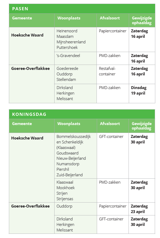Hoeksche Waard – In verband met Pasen op 17 april en 18 april en Koningsdag op 27 april zijn er weer een aantal gewijzigde dagen dat het RAD het afval komt ophalen. De wijzigingen gelden alleen voor onderstaande dorpskernen.