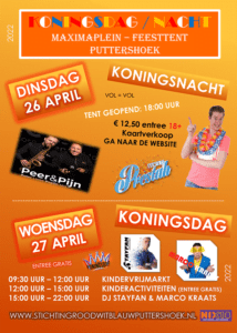 Op 26 & 27 april is het groot feest in de feesttent in Puttershoek! Stichting Rood Wit Blauw Puttershoek organiseeert weer Koningsdag en nacht in het gezellige Puttershoek!