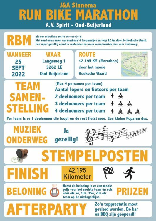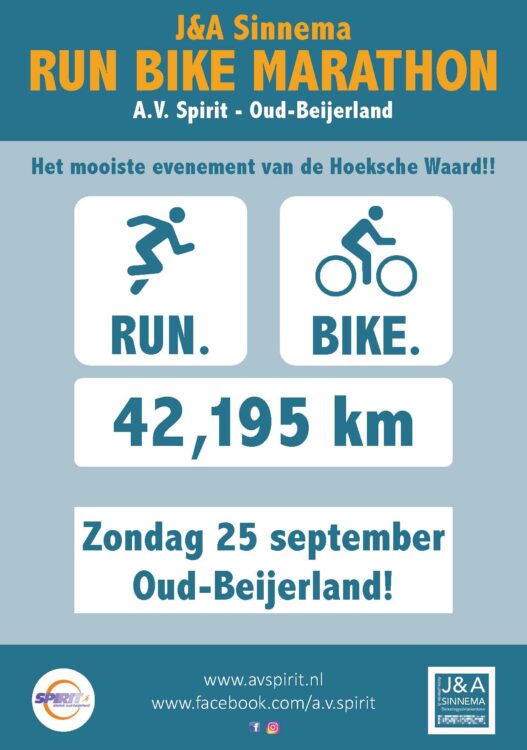AV Spirit organiseert op zondag 25 sept 2022 de 4e Run Bike Marathon in de Hoeksche Waard. Wil je een marathon lopen maar is je lijf er nog niet klaar voor? Of kan je niet genoeg krijgen van de Roparun. Ga dan nu trainen voor de Run Bike Marathon met je loopmaatjes, vrienden, collega’s of Roparun team.