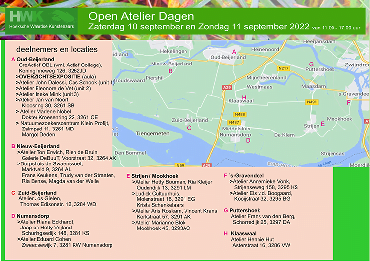 Op 10 en 11 september zijn de jaarlijkse Open Atelier Dagen van St. Hoeksche Waardse Kunstenaars. Het is een laagdrempelig evenement op verschillende locaties in het fraaie landschap van de Hoeksche Waard en een podium voor een ontmoeting met professionele, autonome, veelal lokale kunstenaars en hun unieke en actuele kunst in al zijn vormen. Er zijn 27 deelnemers op 18 locaties te bezoeken op de route door de hele Hoeksche Waard in dorpen, buurtschappen en langs dijken.