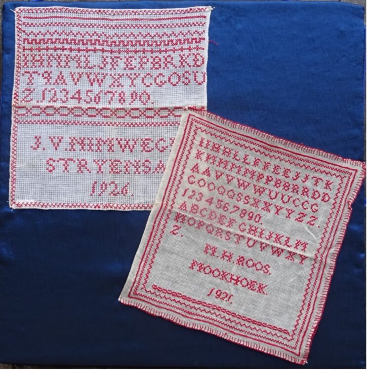De aanwezige merklappen zijn vooral bijzonder omdat de meeste in Strijen zijn gemaakt. We komen verschillende Striense namen tegen. Wat ook opvalt is dat ondanks het schoolvoorbeeld er toch veel variatie is te zien. Of dit altijd van de maakster af kwam is te betwijfelen, bedenk dat je rond je 10e verjaardag wel klaar moest zijn, daarom zijn er ook een aantal niet afgemaakt. Als je klaar was mocht je je naam borduren en het jaartal. Gebruikelijk is het om het jaar waarin de lap af is te gebruiken.