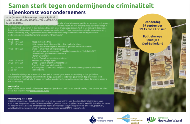 Gemeente, politie, ondernemers en inwoners werken goed samen om deze vorm van criminaliteit het hoofd te bieden. En niet zonder succes! Zo werd onlangs in een bedrijfspand in De Bosschen in Oud-Beijerland nog een grote drugsvangst gedaan. Toch is het belangrijk dat iedereen zich bewust is én blijft van de signalen en gevaren van ondermijning, ook ondernemers. Tijdens de bijeenkomst worden ervaringen uit de praktijk gedeeld en brengt men een bezoek aan de zogenoemde ‘ondermijningscontainer’. De bijeenkomst duurt van 19.15 tot 21.30 uur en vindt plaats op het politiebureau aan de Spuidijk 4 in Oud-Beijerland. Na afloop is er nog gelegenheid om na te praten en te netwerken.