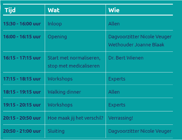 Key note speaker dr. Bert Wienen, bevlogen onderzoeker, adviseur en spreker streeft naar een bredere definitie van normaal. Hij is ervan overtuigd dat, als we het medicaliseren een halt toeroepen, meer kinderen kunnen opgroeien met het idee dat ze normaal zijn – ook als ze afwijken van ‘de norm’.