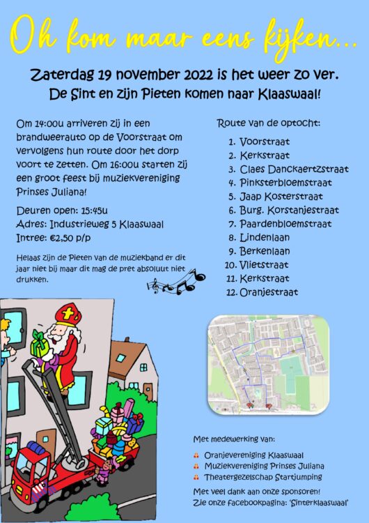 Zaterdag 19 november 2022 is het weer zo ver: De Sint en zijn Pieten komen naar Klaaswaal! Om 14:00u arriveren zij in een brandweerauto op de Voorstraat om vervolgens hun route door het dorp voort te zetten. Om 16:00u starten zij een groot feest bij muziekvereniging Prinses Juliana!