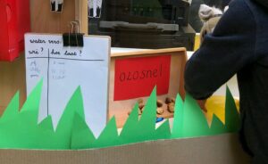 Zo is onder andere het kantoor van Sinterklaas gemaakt waar hij via zijn laptop contact kan hebben met Diewertje Blok. Er is een stal voor Ozosnel in de school, waar leerlingen hem vers water kunnen geven. Natuurlijk wordt hier de tijd netjes opgeschreven wanneer het water wordt ververst. Zo oefenen de kinderen spelenderwijs het klokkijken. Er is ook een inpakkamer waar geoefend wordt met het netjes inpakken van cadeautjes en het schrijven van de juiste namen op de namenstickers. Er kunnen verlanglijstjes geschreven worden, waarbij de kinderen echte catalogussen van een speelgoedwinkel gebruiken zodat ze de prijs er voor de Sint bij kunnen schrijven. Er is een brievenbus voor post aan de Sint en er staat een prachtige stoomboot op het podium met natuurlijk een atlas zodat de kapitein de juiste route kan varen. De leerlingen hebben een eigen pietendossier gekregen met een aftekenkaart van de verschillende hoeken. Ze tekenen nu af waar zij zijn geweest en krijgen zo een overzicht waar ze nog kunnen spelen.