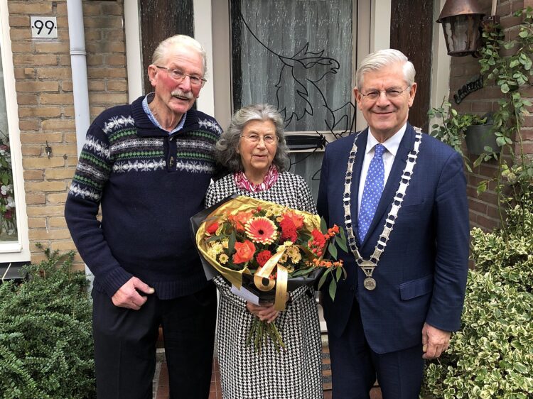 Op 18 december 1957 gaven de heer J.C. (87 jaar) Aartsen en mevrouw H. (84 jaar) Aartsen-Groeneveld uit Puttershoek elkaar het jawoord voor de ambtenaar van de burgerlijke stand. Vandaag ging burgemeester Aptroot bij hen op bezoek met een mooi boeket om hen namens het gemeentebestuur te feliciteren met hun briljanten huwelijksjubileum.