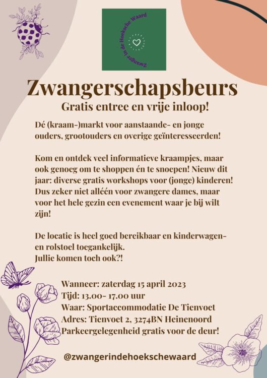 Op zaterdag15 april aanstaande, van 13.00 – 17.00 uur vindt voor de derde keer de zwangerschapsbeurs / kraammarkt van ‘Zwanger in de Hoeksche Waard’ plaats.