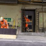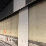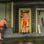 Rijkswaterstaat: We hebben onder andere in het plafond een trapgat gemaakt, zodat het middentunnelkanaal straks vanuit het dienstgebouw bereikbaar is voor bijvoorbeeld onderhoud. Een lintzaag had 2 (!) dagen nodig om door het 1,5 meter dikke beton heen te komen. Op 7 uitsparingen in de middenwand zijn kozijnen van beton gestort. De nieuwe vluchtdeuren komen daar in te hangen. Deze gaten zijn tijdelijk dichtgemaakt met beplating.