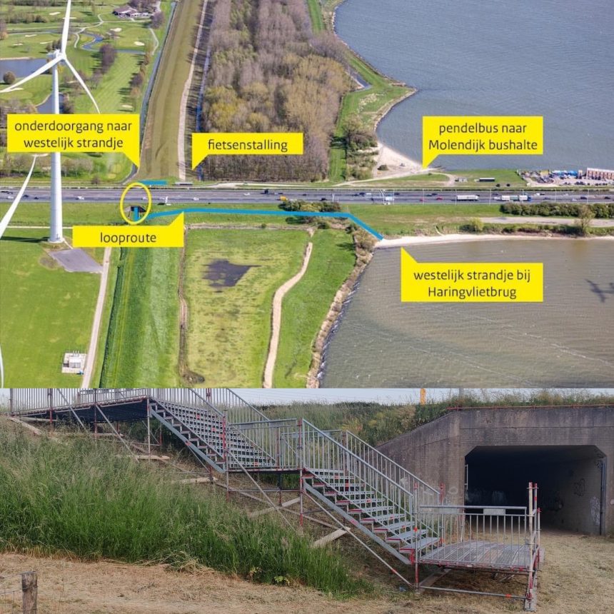 Tijdens de renovatie van de klep van de Haringvlietbrug, kunnen recreanten het strandje aan de westkant van de brug blijven gebruiken. Hiervoor heeft Rijkswaterstaat bij de parallelweg van de A29 een onderdoorgang van de snelweg geschikt gemaakt voor voetgangers.