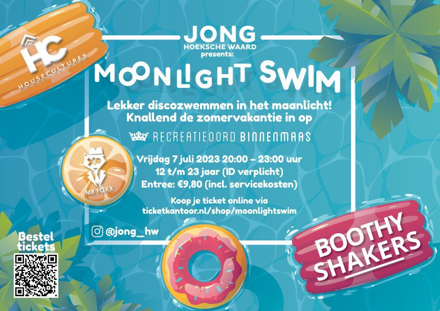 Jong Hoeksche Waard organiseert dit zalige feestje in samenwerking met Recreatieoord Binnenmaas. Geniet van de zomerse beats van Mr. Foxx en Boothyshakers, en als kers op de taart komt ook Auke van HouseCultures de speakers verwennen. Reden genoeg dus om vrijdagavond 7 juli het recreatieoord op z’n kop te komen zetten. De Moonlight Swim vindt plaats van 20:00 – 23:00 uur en is toegankelijk voor iedereen van 12 t/m 23 jaar.
