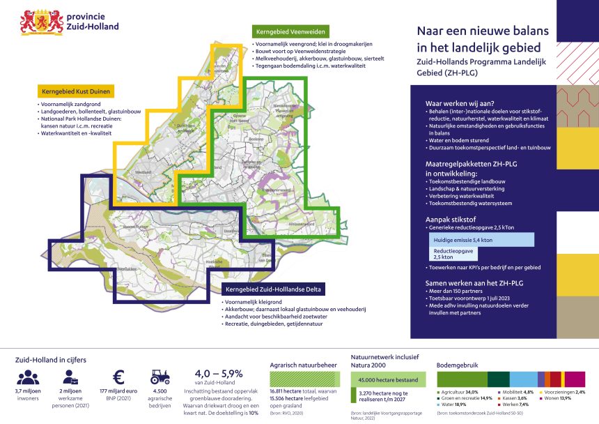 Natuur herstellen, emissies van stikstof en broeikasgassen reduceren en waterkwaliteit verbeteren. Dat zijn de opgaven voor het Zuid-Hollands Programma Landelijk Gebied (ZH-PLG). Wij werken, samen met onze gebiedspartners, aan een nieuwe balans in het landelijk gebied. Met als doel dat iedereen in Zuid-Holland kan wonen en werken in een gezonde omgeving en onze land- en (glas)tuinbouw een duurzame economische toekomst heeft. De opbrengst uit de gebiedsprocessen is benut voor het toetsbaar voorontwerp ZH-PLG. Met het presenteren van het toetsbaar voorontwerp geeft de provincie richting aan een nieuwe balans in het landelijk gebied. De komende jaren zetten wij de samenwerking met onze partners en het Rijk voort bij de uitwerking van het programma.