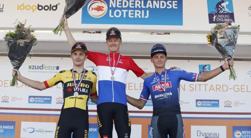 Dylan van Baarle is de nieuwe Nederlands kampioen. In de finale reed hij weg uit de kopgroep, waarna hij zijn handen in Sittard-Geleen in de lucht mocht steken. Olav Kooij werd knap tweede na een lange dag in de vlucht..
