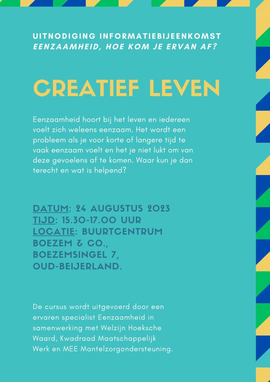 Op de website van Welzijn Hoeksche Waard vind je onder nieuws meer informatie over de informatiebijeenkomst en de mogelijkheid om je aan te melden voor de cursus www.welzijnhoekschewaard.nl/hulp/cursus-creatief-leven.