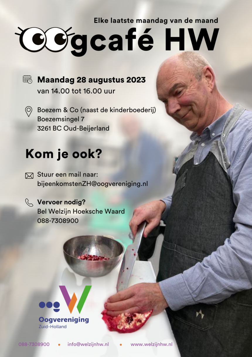 Elke laatste maandag van de maand in 2023 wordt er een Oogcafé georganiseerd. De eerst volgende bijeenkomst is op maandag 28 augustus aanstaande. Het Oogcafé Hoeksche Waard is dé plek waar alle zintuigen aan bod komen! Het café is in de eerste plaats bedoeld voor alle inwoners van de Hoeksche Waard en omstreken met een oogaandoening of zichtprobleem. Maar uiteraard zijn ook partners, familieleden, vrienden of andere geïnteresseerden van harte welkom.