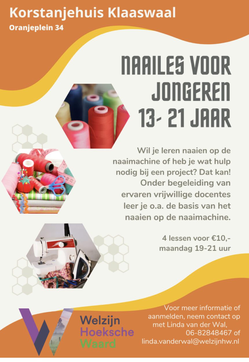 Binnenkort start Welzijn Hoeksche in het Korstanjehuis in Klaaswaal, Oranjeplein 34, weer met een serie naailessen voor jongeren tussen 13 en 25 jaar.