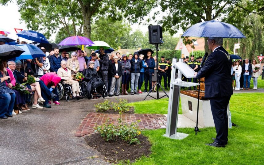 Vanmiddag vond op deze plek een emotionele herdenkingsbijeenkomst plaats bij de door lokale kunstenaars (Jos Gielen en Ankie de Groot-Winkelman) ontworpen herinneringsbank.