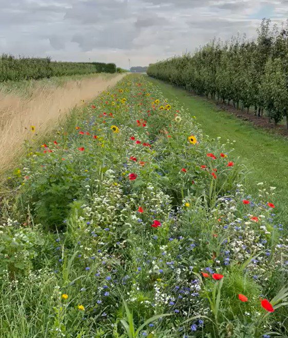 De bloemenranden langs de akkers zijn sinds 2005 bekend in de Hoeksche Waard. Ze waren de eerste jaren vooral gericht op waterkwaliteit en vormden een buffer tussen het gewas en de sloot. Vervolgens werd ook biodiversiteit een belangrijke doelstelling en vooral Functionele AgroBiodiversiteit (FAB): hoe kan biodiversiteit worden ingezet voor de agrarische bedrijfsvoering? In de akkerbouw kunnen akkerranden een belangrijke rol vervullen voor natuurlijke plaagbestrijding. De verschillende soorten bloemen in de randen die in het kader van het agrarisch natuurbeheer worden aangelegd zijn zo geselecteerd dat ze over een zo lang mogelijke periode insecten aantrekken die de luizen in het gewas op de akker bestrijden. Maar ook voor een fruitteeltbedrijf kan dit van belang zijn. Dit jaar is er in de Hoeksche Waard nu voor het eerst in het kader van het agrarisch natuurbeheer een bloemrijke ‘akker’rand in een boomgaard aangelegd.