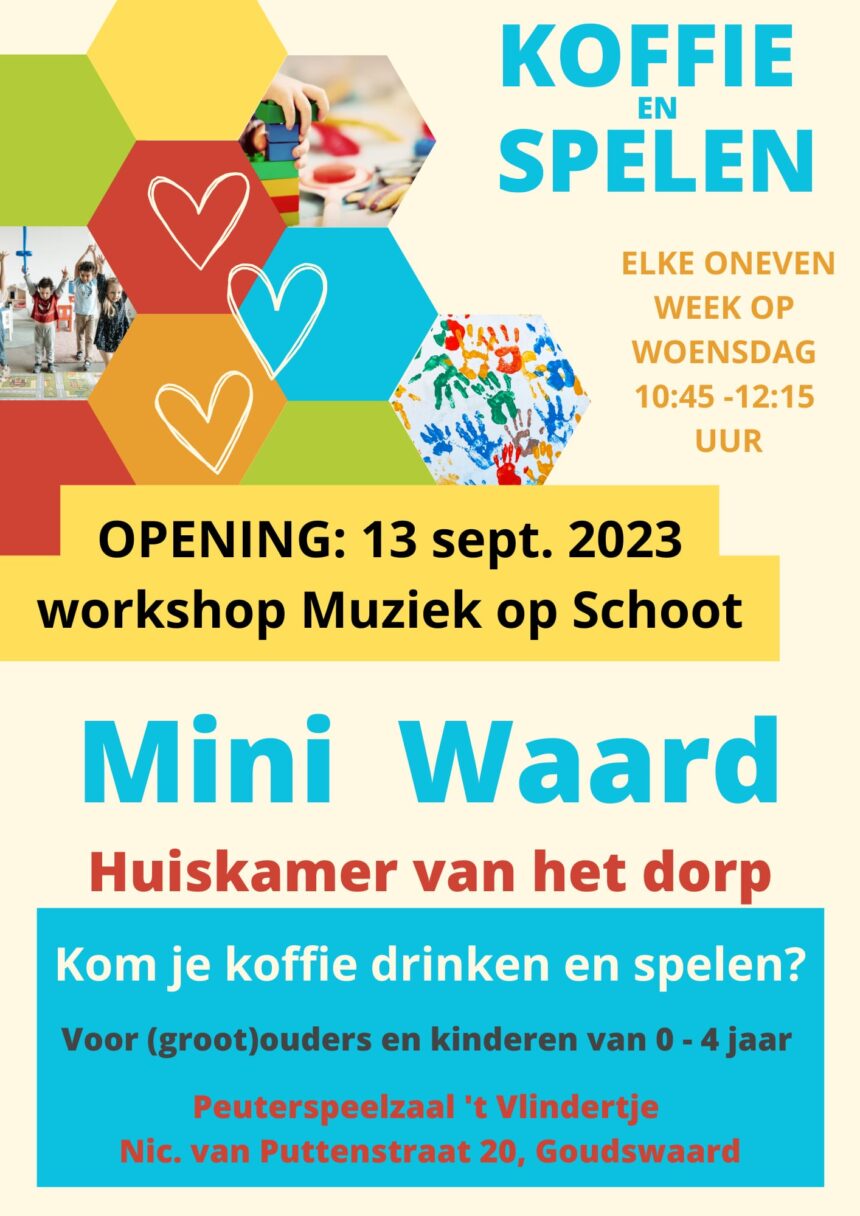 Woensdag 13 september is de opening van de Mini Waard in Peuterspeelzaal ’t Vlindertje in Goudswaard . Alle ouders/verzorgers/grootouders van een kind van 0-4 jaar zijn welkom.