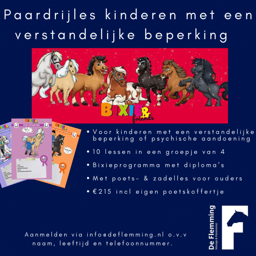 In de Kleuterlessen wordt een start gemaakt met de KNHS Bixie Ruiteropleiding. In deze opleiding leren kinderen niet alleen alles over de omgang met en de verzorging van pony’s, maar leren zij ook de basis van het paardrijden. In 10 lessen van een uur verdienen de kinderen verschillende diploma’s en onderdeel van de lessen is ook een poets- en zadelles voor de ouders. Helemaal leuk is dat de kinderen bij dit lespakket ook een gepersonaliseerd poetskoffertje met borstels krijgen.Daarnaast wordt er in oktober ook gestart met Paardrijles voor kinderen met een verstandelijke beperking of psychische aandoening. Deze lessen zijn speciaal voor kinderen voor wie een normale groepsles door hun beperking te druk of te intensief is. In een groep van maximaal 4 krijgen de kinderen 45 minuten les en ook zij behalen gedurende 10 lessen verschillende Bixie diploma’s en een eigen poetskoffertje met inhoud.