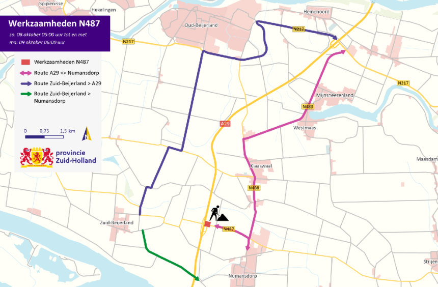 - Het verkeer uit Numansdorp richting Zuid-Beijerland wordt omgeleid via Klaaswaal, Westdijk, Mijnsheerenland en de A29.