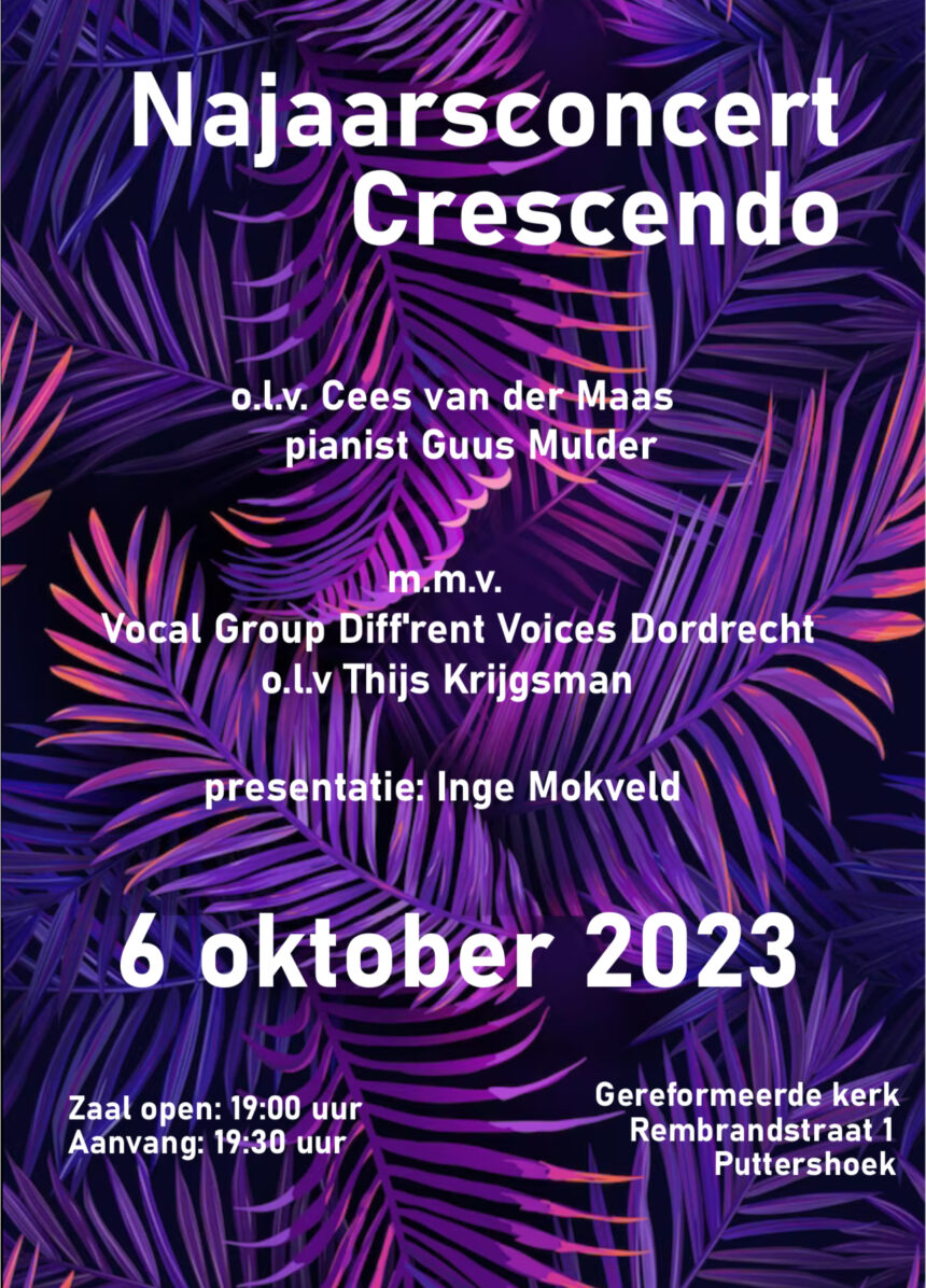 Op 6 oktober organiseert Crescendo weer een gezellig avondje muziek in de gereformeerde kerk van Puttershoek met Diff’rent Voices. Komt u ook?