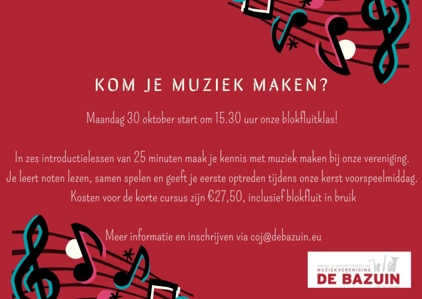 Altijd al eens willen leren blokfluit spelen? Dit is je kans! Muziekvereniging de Bazuin start vanaf maandag 30 oktober met een serie blokfluit lessen.