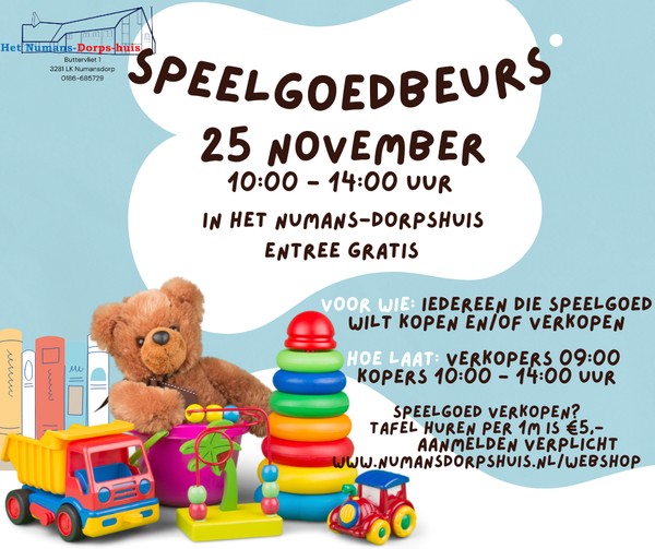 Op zaterdag 25 november is een speelgoedbeurs in het dorpshuis van Numansdorp Van 10.00 tot 14.00 uur is de beurs op Buttervliet 1 gratis te bezoeken.