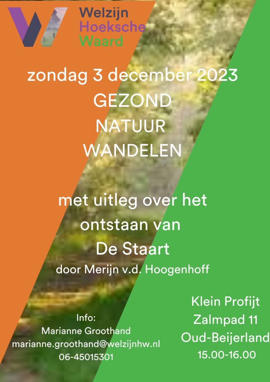 Zondag 3 december 2023 zal er weer een wandeling van 2023 van Gezond Natuur Wandelen vanaf Klein Profijt, Zalmpad 11 te Oud-Beijerland plaatsvinden. Deze keer zal Merijn van den Hoogenhoff tijdens de wandeling het ontstaan van de Staart uitleggen.De wandeling start bij Klein Profijt, om 15.00 uur. Na afloop van de wandeling kunt u samen een kopje koffie of thee drinken. Aanmelden vooraf voor de wandelingen is niet nodig en is gratis.