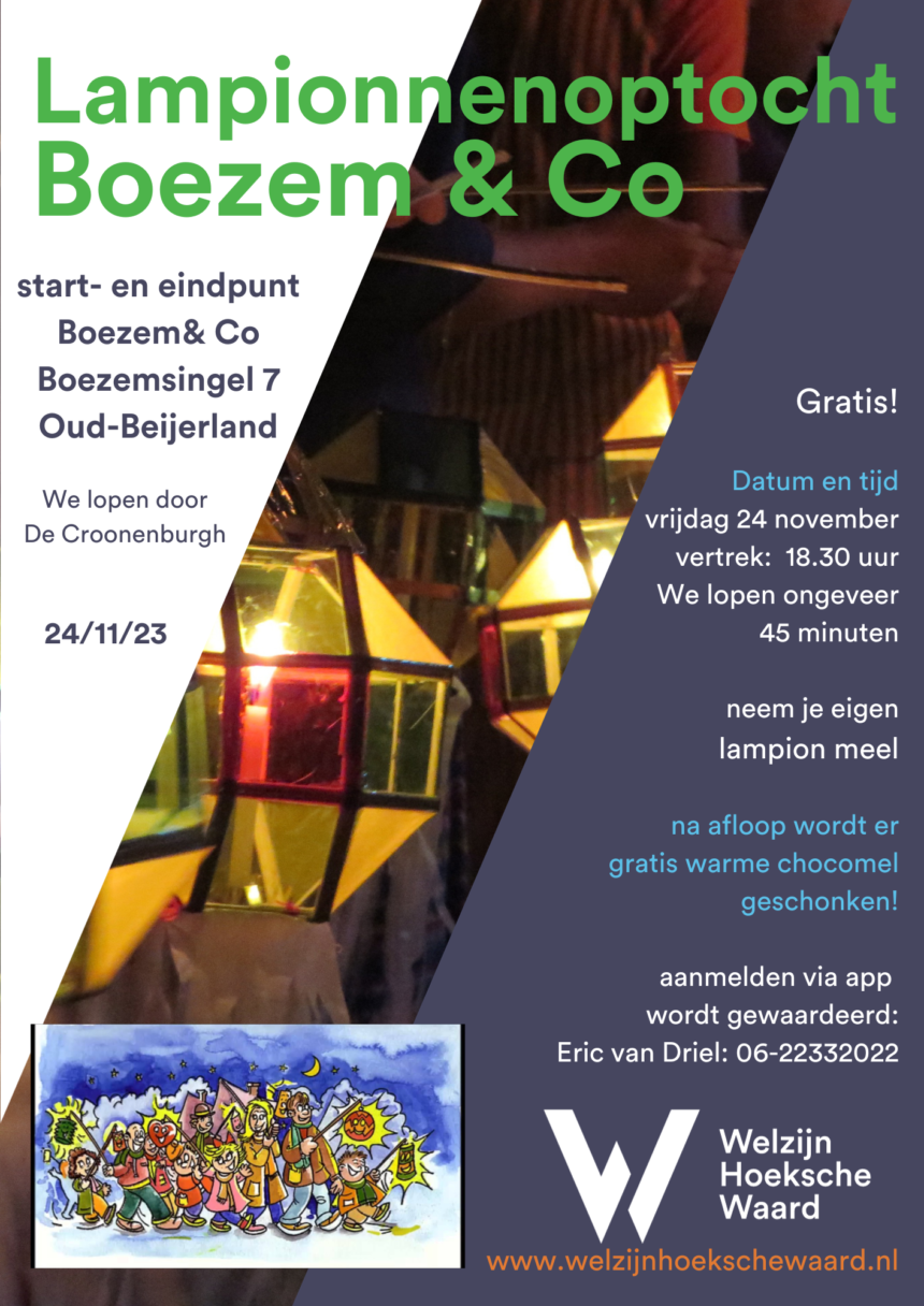 Bewoners en Welzijn Hoeksche Waard organiseren op vrijdag 24 november een lampionnenoptocht door de Croonenburg wijk in Oud-Beijerland met als startpunt Boezem & Co. Iedereen die het leuk vindt om mee te lopen, van jong tot oud, is van harte welkom. Dus haal je lampion uit de kast en trek je wandelschoenen aan! We verzamelen voor de deur van Boezem & Co aan de Boezemsingel 7 en zullen om 18.30 vertrekken.