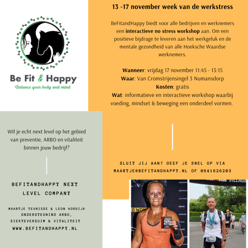 Van maandag 13- t/m vrijdag 17 november is het de week van de werkstress. De laatste paar jaar zien we dat de stress op de werkvloer is toegenomen. Maartje wil hier graag een positieve bijdrage aan willen leveren. BeFitandHappy biedt dan ook voor alle bedrijven en werknemers een interactieve no stress workshop aan op vrijdag 17 november van 11:45-13:15.