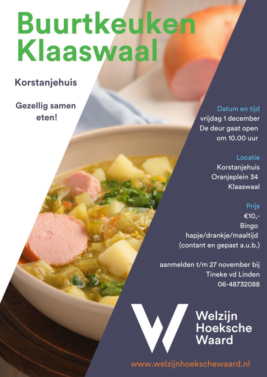 Vrijdag 1 december is er weer een gezellige Buurtkeuken in het Korstanjehuis in Klaaswaal (Oranjeplein 34). Deze activiteit wordt georganiseerd door een groep enthousiaste vrijwilligers van Welzijn Hoeksche Waard en is speciaal bedoeld voor 55+ers. U bent vanaf 10.00 uur van harte welkom en de verwachting is dat het rond 13.15 uur weer afgelopen is.