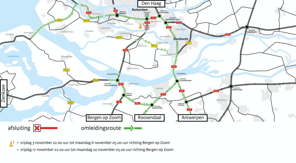 - Lokaal verkeer naar de Hoeksche Waard wordt omgeleid via de A15, A16 en N217 (via de Kiltunnel)