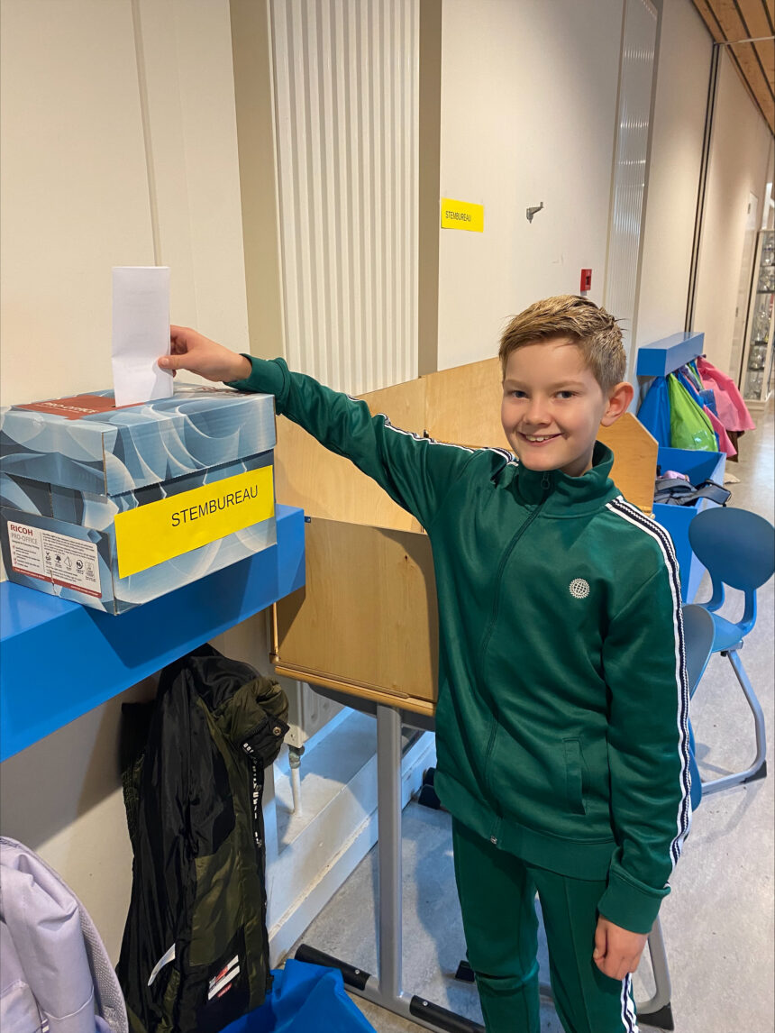 In alle klassen is de afgelopen dagen veel gesproken over de verkiezingen: over politieke partijen, lijsttrekkers, partijprogramma’s en kieslijsten. In het groot ging het natuurlijk over de landelijke verkiezingen voor een nieuwe Tweede Kamer maar op school zelf viel ook wat te kiezen: de kinderen konden zelf een stem uitbrengen op een nieuwe klassenvertegenwoordiger voor het leerlingenparlement. Zo zijn de kinderen ook gesprekspartner met de directie van de school!