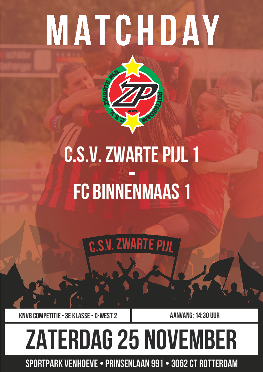 FC Binnenmaas begon goed en energiek aan de wedstrijd en dat leverde wat kleine kansjes op voor Rik Schouten en Jannick v.d. Laan. Zwarte Pijl probeerde juist met lange ballen naar voren op de snelle en behendige voorwaartsen gevaarlijk te worden. Zo ontstond er een waar voetbal gevecht die, zowel sportief en met respect, zich vooral op middenveld afspeelde. Na ruim een half uur kwam de eerste grote kans voor FC Binnenmaas. Daan Leggedoor was de verdediging van Zwarte Pijl te snel af maar zijn harde schot werd knap gestopt met de voet door de doelman. De rebound werd daarna te gehaast en te hard over de goal gewerkt door de aangesloten Rik Schouten. Toch kwam er een wijziging in de stand net voor rust. Na balverlies op het FC Binnenmaas middenveld schakelde Zwarte Pijl snel om. Ismail Celen speelde de handige buitenspeler Shabani Rajabu aan. Deze stond duidelijk stil op dat moment en in buitenspel positie. De vlag van assistent scheidsrechter Martin Remmers ging terecht de lucht in maar scheidsrechter Laros dacht daar anders over en liet doorspelen. Zo kon de rechtsbuiten alleen op doelman Thijs Botterhuis af en knalde de 1-0 ruststand op het bord. De scheidsrechter ging nog wel verhaal halen bij assistent scheidsrechter Martin Remmers, maar volgens hem had hij het toch echt anders gezien. Vreemd dat bij elk vlagsignaal van de assistent scheidsrechter van Zwarte Pijl wel steeds zijn vreemde waarnemingen (2x buitenspel en achterbal?) door hem werden overgenomen. Zo kon de supporters schare van FC Binnenmaas dus met een achterstand aan de overheerlijke Surinaamse broodjes in de rust.