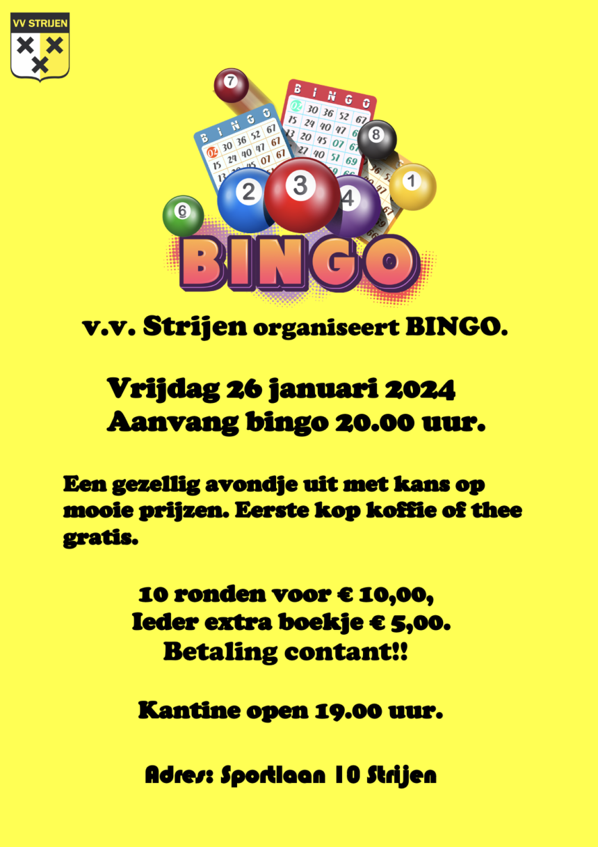 v.v. Strijen organiseert voor de bingo liefhebbers op vrijdagavond 26 januari weer een bingoavond! De aanvang van de bingo is om 20.00 uur. Een gezellig avondje uit met kans op mooie prijzen.